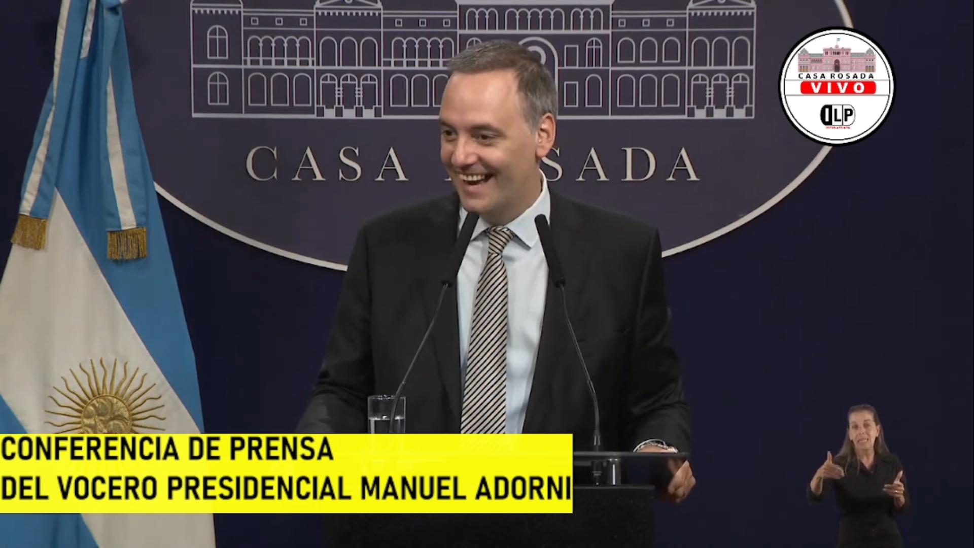 En conferencia de prensa en la Casa Rosada, Adorni también aclaró que la ministra de Capital Humano, Sandra Pettovello, “jamás ha convocado” al “grupo de personas» que fue esta mañana hasta la puerta de esa cartera nacional, y aseguró que “de ninguna manera los alimentos pueden ser una variable de ajuste, lo que sí lo es y lo será siempre son los intermediarios».