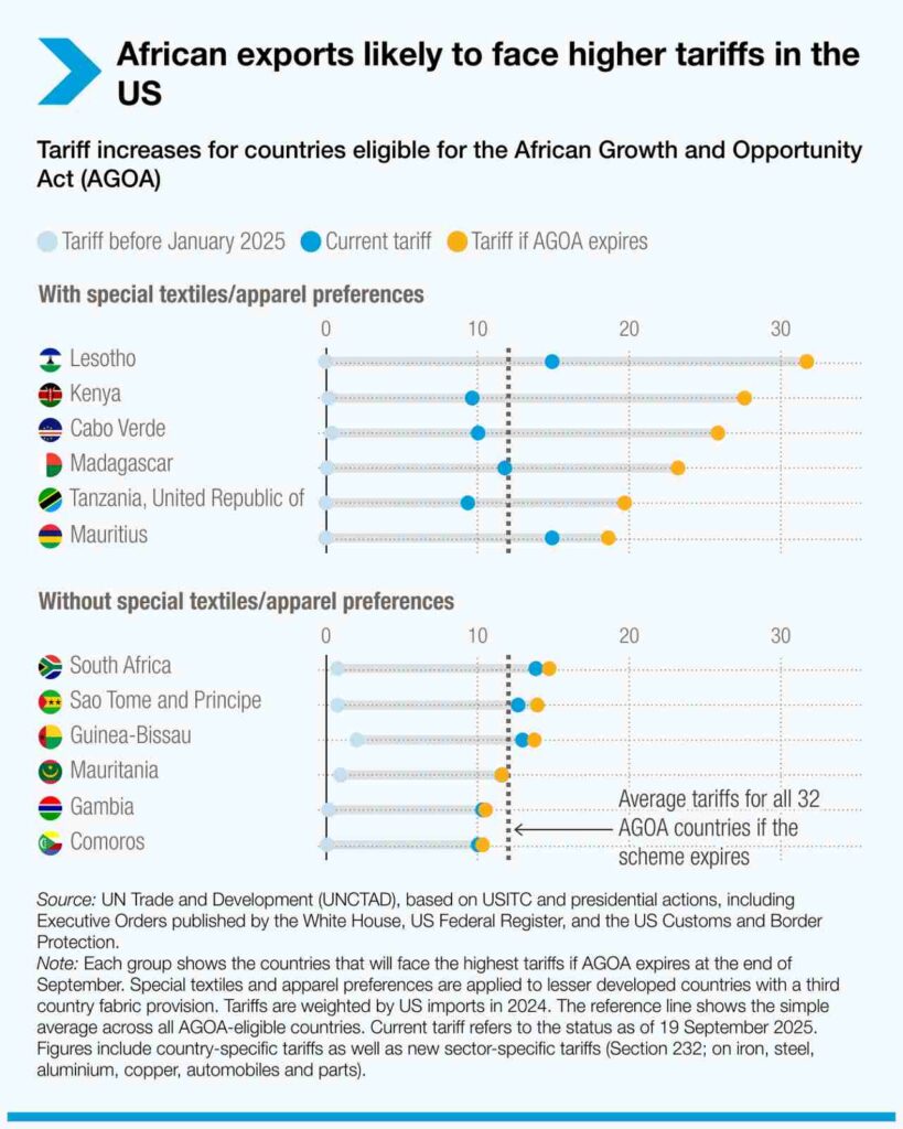 Desde abril de 2025, el aumento de los aranceles estadounidenses –en particular los aranceles específicos por país aplicados el 7 de agosto de 2025 y nuevas medidas comerciales sectoriales– ha encarecido una amplia gama de productos, independientemente de las preferencias de la AGOA.
