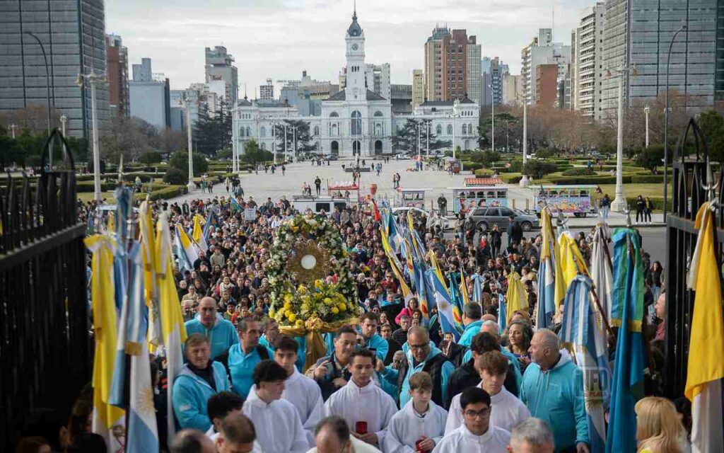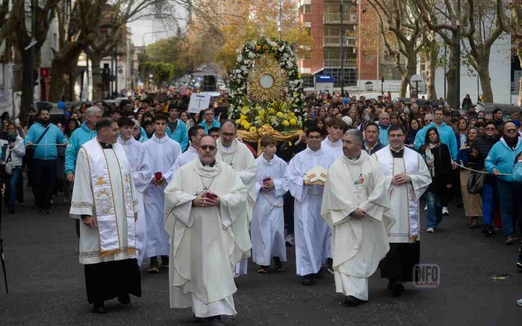 La celebración, que incluyó espacios de catequesis y confesiones, comenzó en la Plaza San Martín con la exposición del Santísimo y un breve momento de adoración eucarística, y continuó con la tradicional procesión de Corpus hacia la Catedral.