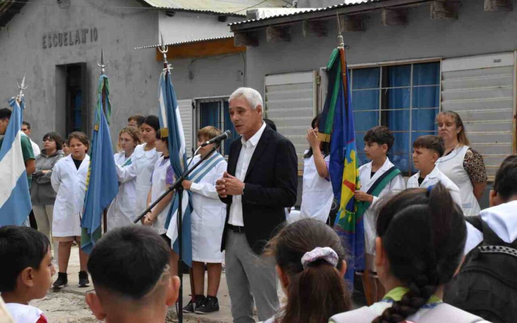 Esta mañana, el intendente municipal Fabián Cagliardi, encabezó el acto central de inicio del ciclo lectivo 2026 en la Escuela Primaria N°10 “General José de San Martín” del barrio Los Talas.