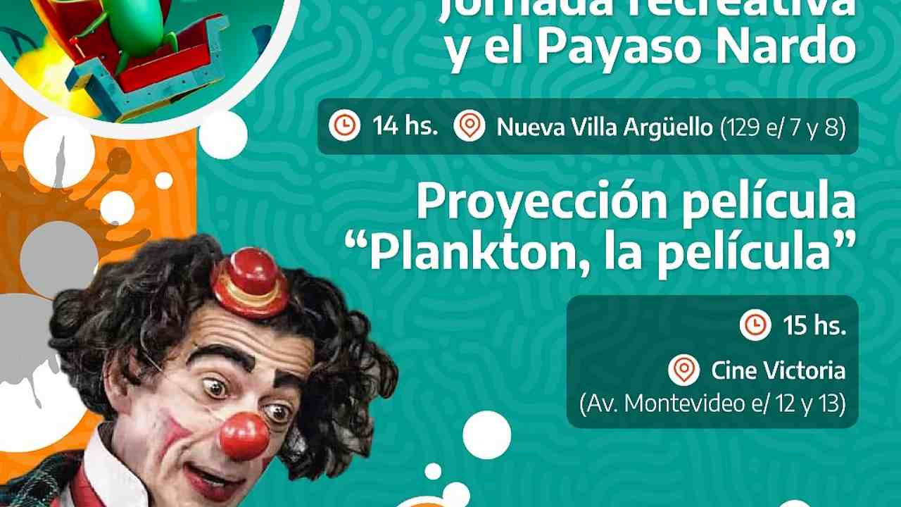 14 hs. – Jornada recreativa con la participación del Payaso Nardo - Cine Victoria (Av. Montevideo e/12 y 13)