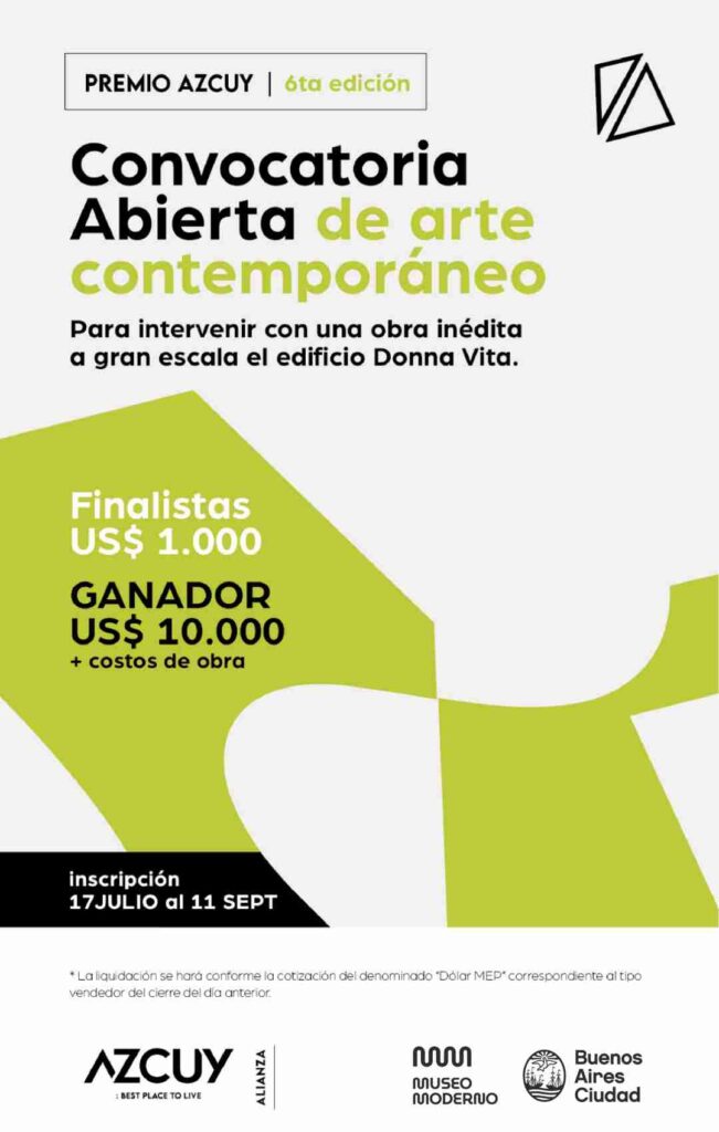 Así, hasta 11 de septiembre, los interesados deberán ingresar a www.premioazcuy.com, para conocer las bases y condiciones, y acceder a la documentación necesaria para el proceso de inscripción. Al cierre de la convocatoria, un jurado de expertos integrado por artistas, curadores, representantes del Museo Moderno y de Azcuy seleccionará 5 finalistas a quienes se les otorgará un premio estímulo de $1.000 dólares (según cotización dólar MEP) para desarrollar sus propuestas con mayor profundidad que, luego, volverán a exponer al jurado.