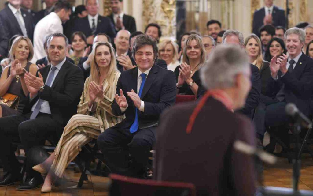 El Presidente estuvo acompañado por la secretaria general de la Presidencia, Karina MIlei, y ministros del Poder Ejecutivo, entre otros funcionarios, empresarios, miembros de la orquesta de Aeropuertos Argentina y familiares del músico italiano.