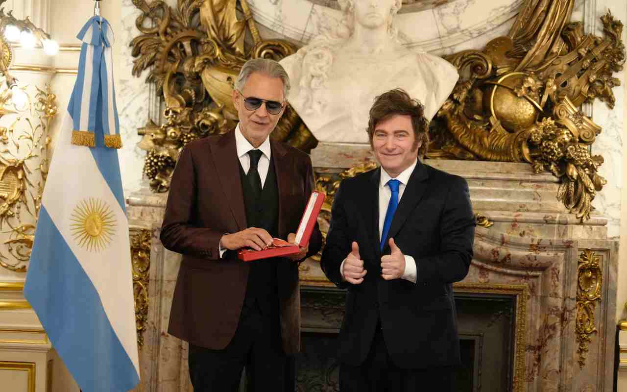 El mandatario otorgó este mediodía la Condecoración de la Orden de Mayo al Mérito en el grado de Comendador a Andrea Bocelli, una de las más altas distinciones de la Argentina que simboliza el reconocimiento por sus méritos y contribuciones.