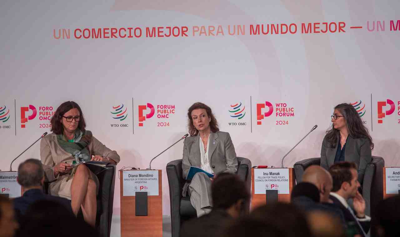 En el marco de su visita oficial a Suiza y Austria, la Canciller Diana Mondino participó ayer en la sede de la OMC, ciudad de Ginebra, del Foro Público 2024 -evento que cada año convoca a cientos de especialistas del mundo para analizar la situación del sistema multilateral de comercio-, donde disertó en el Panel de alto nivel “Cosechando inclusividad: repensando el comercio agrícola”.