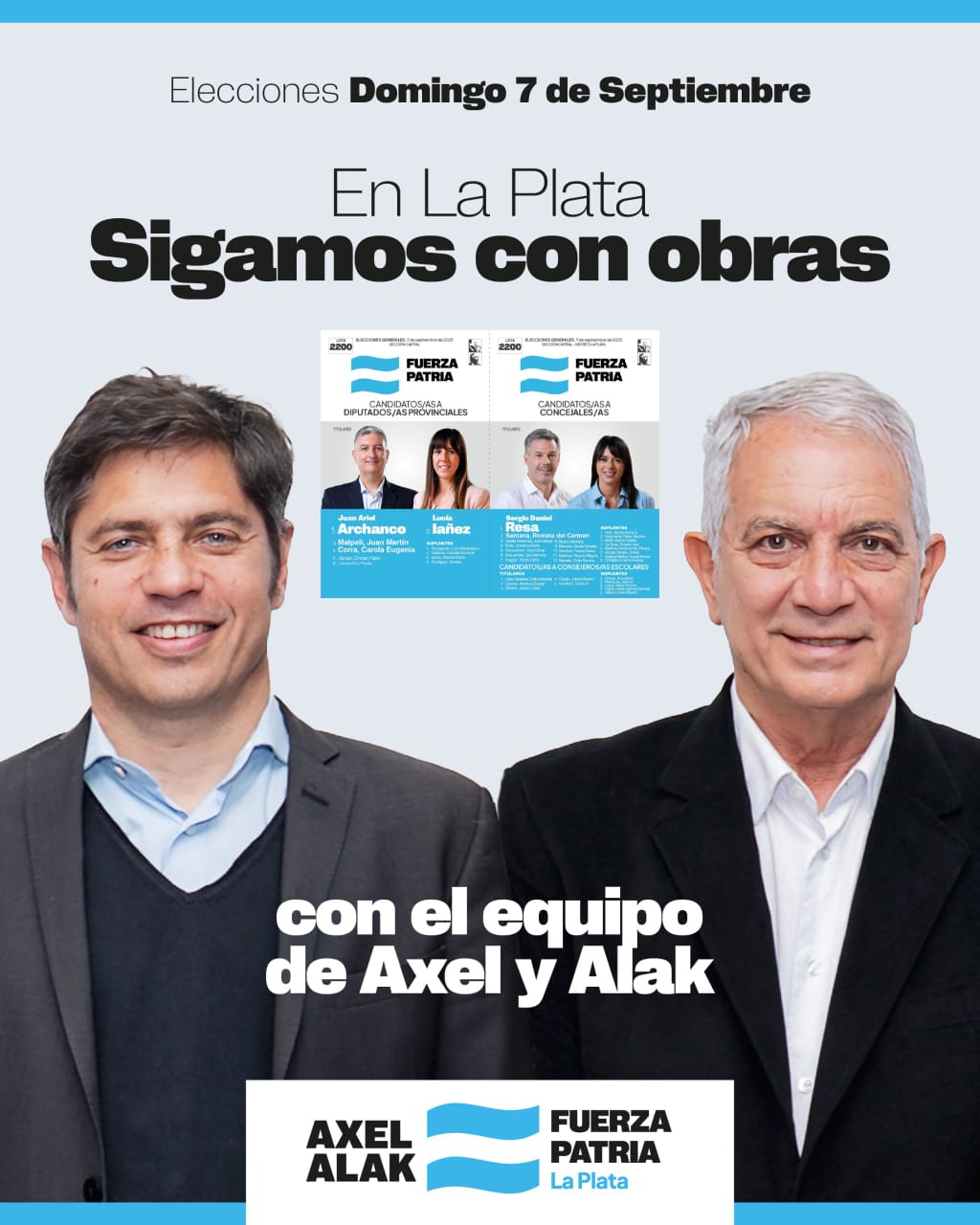 La misma, que es encabezada por los candidatos a Diputados, Ariel Archanco y Lucía Iañez; y los candidatos a Concejales, Sergio Resa y Romina Santana, propone dos mensajes clave para la sección capital: acompañar “al equipo de Axel y Alak” y “En La Plata, sigamos con obras”.