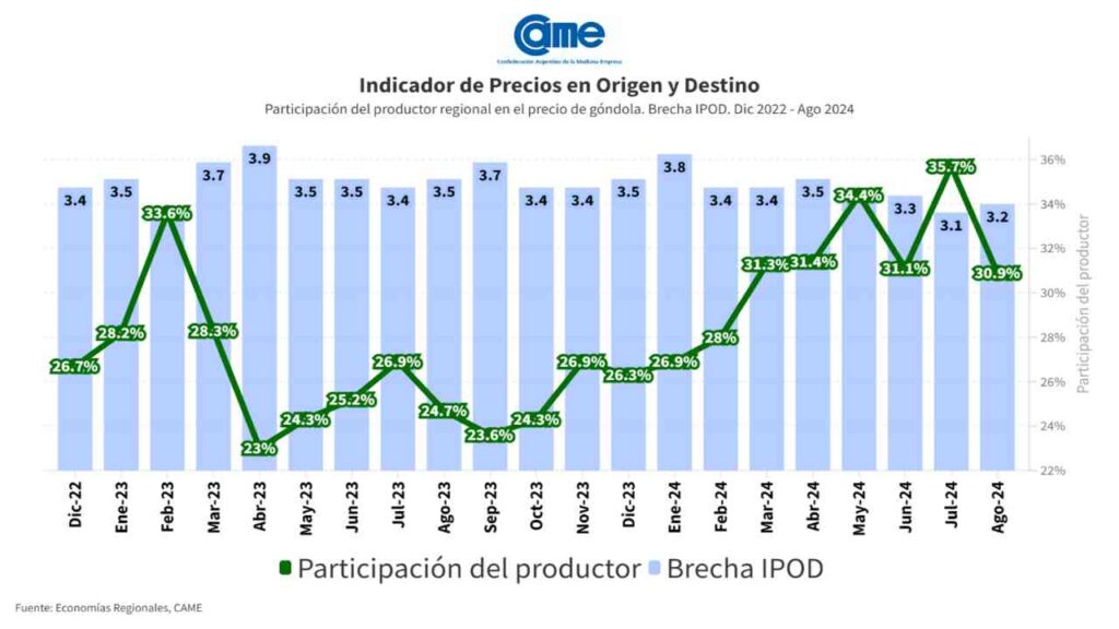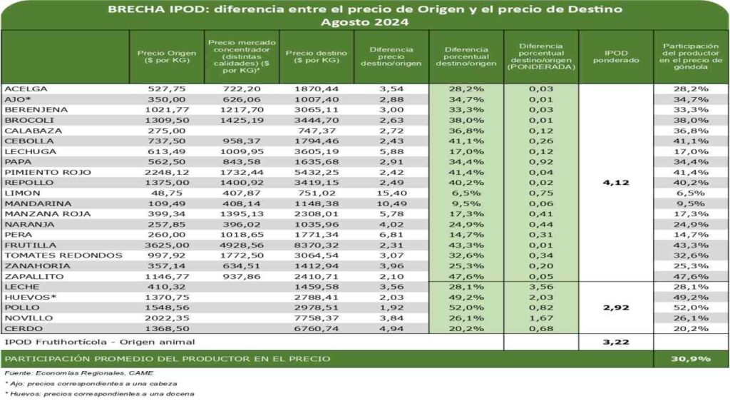 Los precios de los agroalimentos se multiplicaron por 3,2 veces del campo (origen) a la góndola (destino) en agosto. Es decir, el consumidor pagó $3,2 por cada $1 que recibió el productor, según el Indicador de Precios en Origen y Destino (IPOD) elaborado por el sector de Economías Regionales de la Confederación Argentina de la Mediana Empresa (CAME).