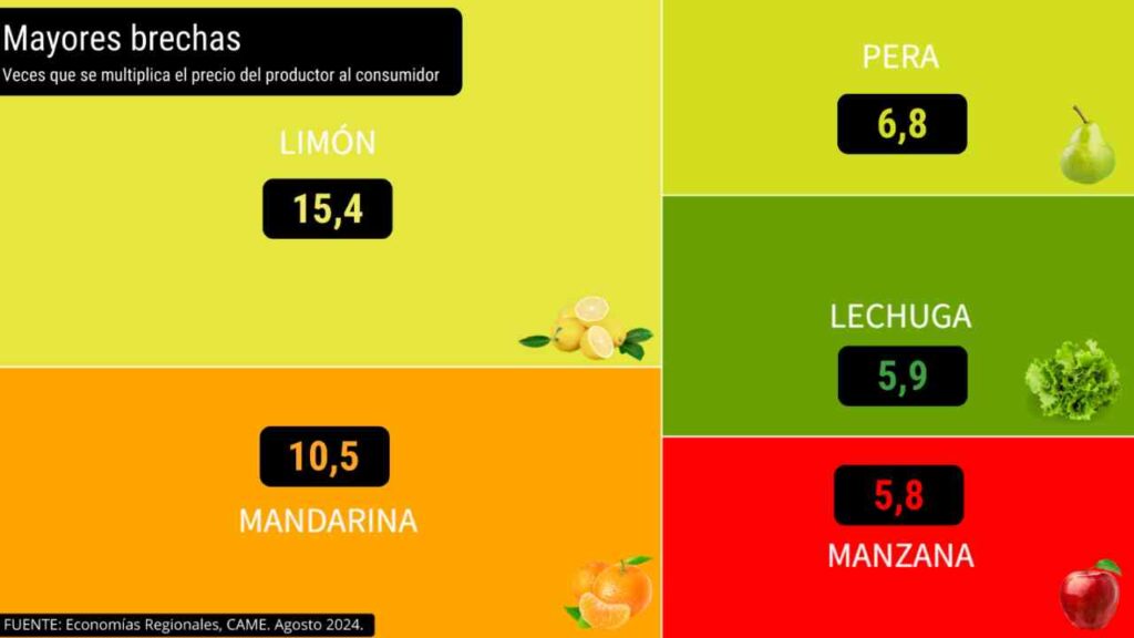 El limón (15,4 veces), la mandarina (10,5), la pera (6,8), la lechuga (5,9) y la manzana roja (5,8), fueron los cinco productos que presentaron mayor diferencia entre los precios de origen y destino.