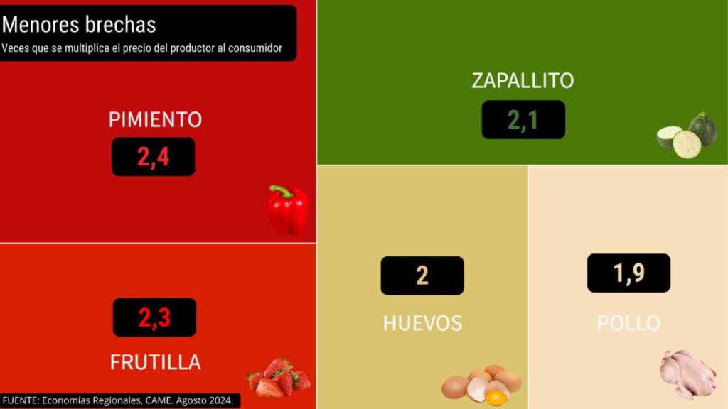 Con 1,9 veces, el pollo fue el producto con menor brecha en el mes de agosto, aumentando sus precios en origen (18,5%) y disminuyendo 0,6% en destino. Los huevos (2), por su parte, aumentaron un 5,4% en góndola, pero bajaron 1% al productor. Cabe mencionar que ambos productos se están produciendo con variaciones en los costos estructurales, ya que la materia prima de los alimentos balanceados está con baja de precios.