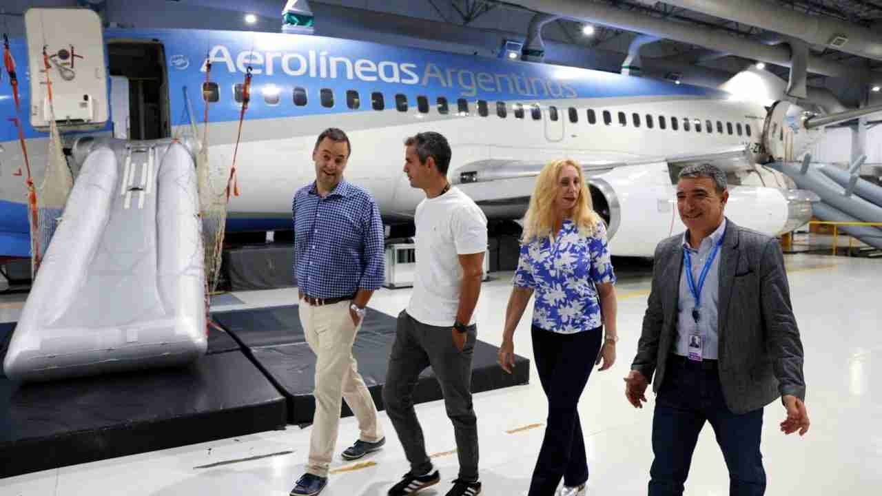La Secretaria General de la Presidencia, Karina Milei, el Presidente de la Cámara de Diputados, Martín Menem y el vocero presidencial, Manuel Adorni visitaron hoy los simuladores de vuelo, el sector de entrenamiento del personal y el Hangar 5 de Aerolíneas Argentinas.