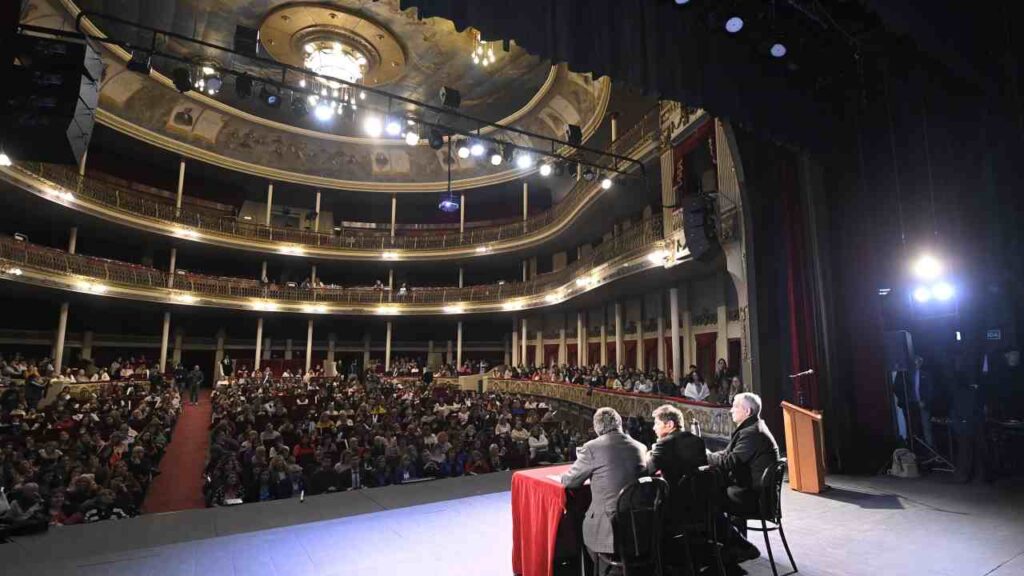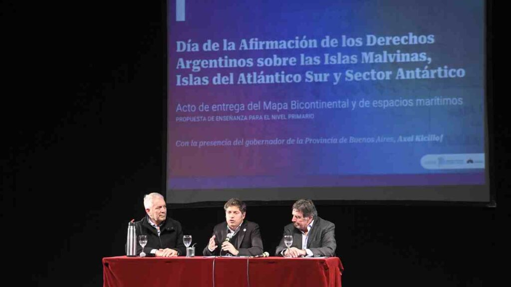 El gobernador de la provincia de Buenos Aires, Axel Kicillof, encabezó este lunes el cierre de una jornada por el Día de la Afirmación de los Derechos Argentinos sobre las Islas Malvinas, Islas del Atlántico Sur y Sector Antártico. Fue en el Teatro Municipal Coliseo Podestá de La Plata, junto al director general de Cultura y Educación, Alberto Sileoni; y el intendente local, Julio Alak.