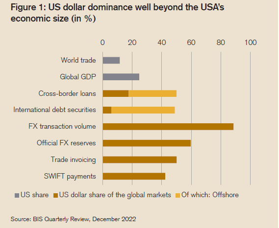 A pesar de una leve reducción en su peso en las reservas internacionales, el dólar estadounidense sigue siendo un indicador clave de hegemonía monetaria. No obstante, los tipos de cambio flotantes y la disponibilidad de líneas swap entre bancos centrales disminuyen la necesidad de reservas en moneda extranjera. Un debilitamiento severo de la estabilidad económica de Estados Unidos podría conducir a una salida brusca del dólar, lo que afectaría la confianza en esta moneda. Los dos partidos políticos estadounidenses dominantes han identificado esta amenaza en el contexto de la competencia con otras grandes economías.