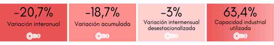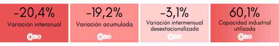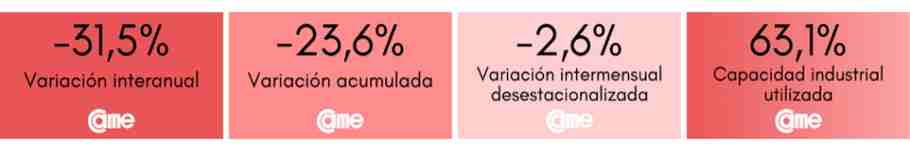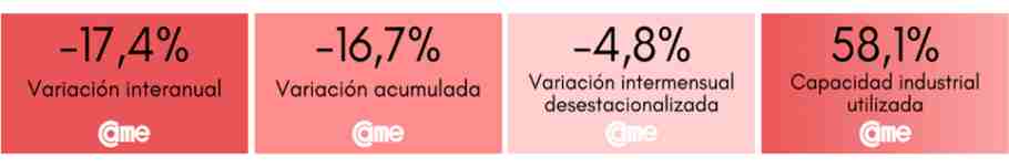 El sector registró una caída de 17,4% anual a precios constantes en junio y de -4,8% en la comparación mensual. Para el primer semestre del año acumula una baja de 16,7% anual. Las industrias operaron con apenas 58,1% de su capacidad instalada en el sexto mes del año (72,4% en mayo), niveles muy bajos para lo habitual del sector.