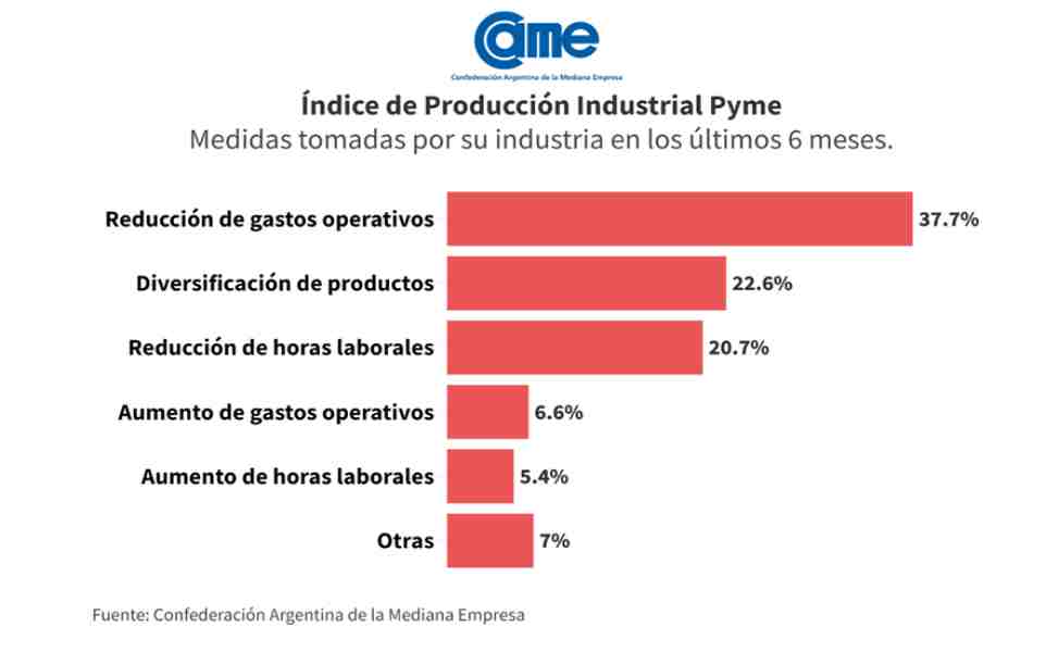 Los datos surgen del Índice de Producción Industrial Pyme (IPIP) que elabora la Confederación Argentina de la Mediana Empresa (CAME), con una muestra que alcanzó a 420 industrias pyme a nivel federal.