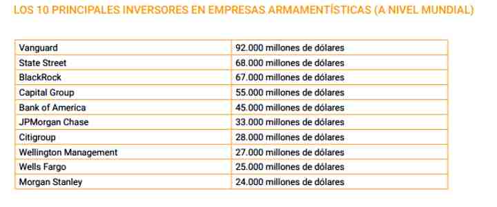 Detrás de esas empresas están los accionistas, donde los mayores inversores resultan los sospechosos habituales. Según el informe Financiar la Guerra. Financiar la Paz. Cómo la Banca con Valores promueve la paz en un mundo cada vez más conflictivo, el principal inversor del mundo en empresas armamentísticas es el fondo de inversión Vanguard, con 92.000 millones de dólares. Le sigue State Street con 68.000 millones y completa el podium BlackRock con 67.000 millones invertidos. El resto de la lista: Capital Group, Bank of America, JP Morgan Chase, Citigroup, Wellington Management, Wells Fargo y Morgan Stanley.