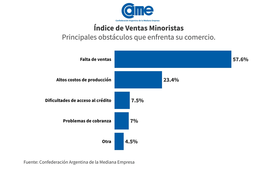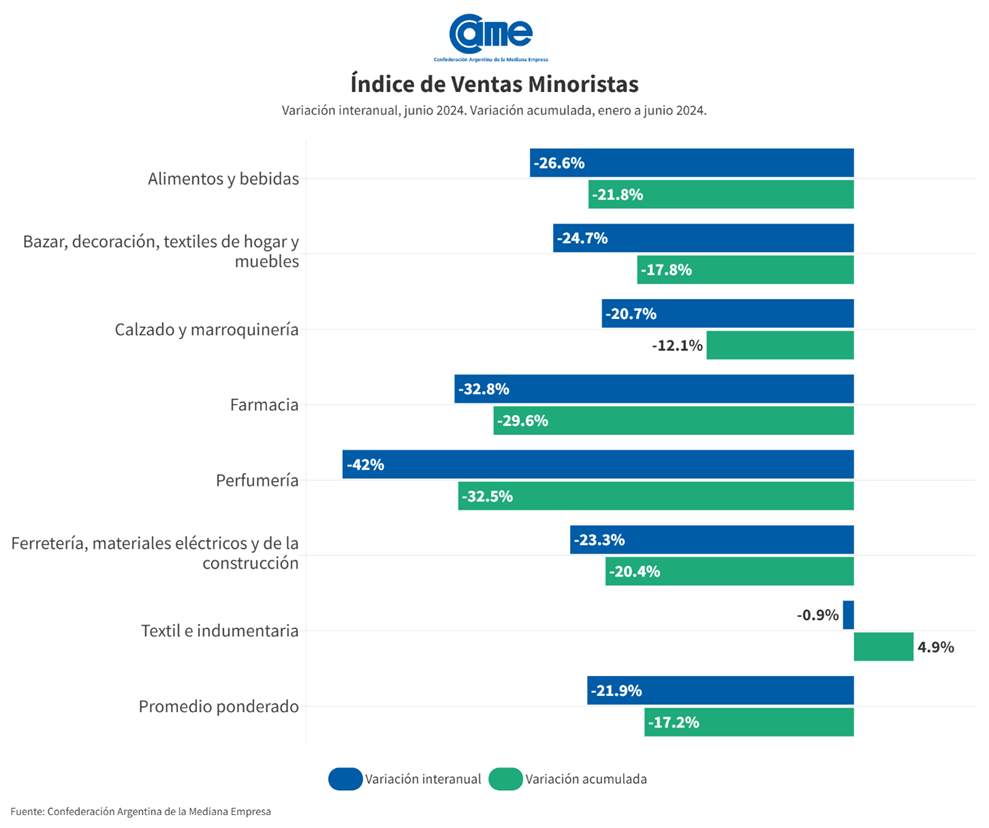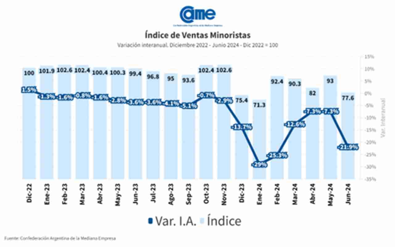 Así surge del Índice de Ventas Minoristas Pymes de la Confederación Argentina de la Mediana Empresa (CAME), elaborado en base a un relevamiento mensual entre 1.276 comercios minoristas del país, realizado del 1 y 5 de julio.