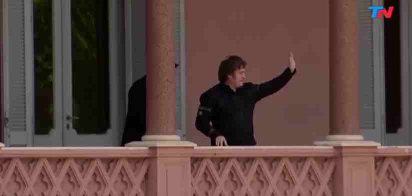 Milei sorprendió al salir para saludar y sorprendió a la gente en la Plaza de Mayo. La aparición del presidente en el balcón del primer piso fue cerca de las 13 y duró pocos segundos. Estaba acompañado por uno de sus custodios.