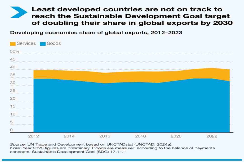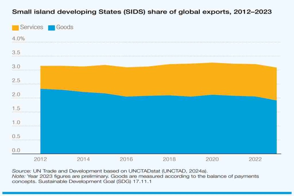 En 2023, los pequeños Estados insulares en desarrollo representaban el 3% de las exportaciones mundiales de mercancías y servicios, mientras que las economías en desarrollo representaban colectivamente el 40%.