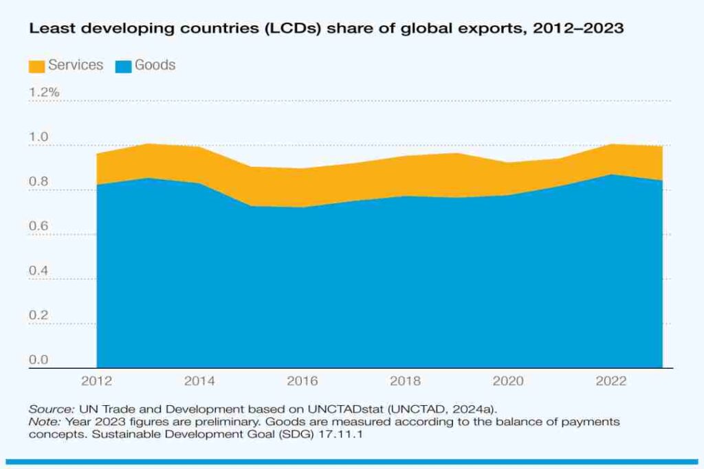 A pesar del crecimiento en términos absolutos, la participación de los países menos adelantados (PMA) en las exportaciones mundiales se ha estancado en torno al 1% desde 2011.