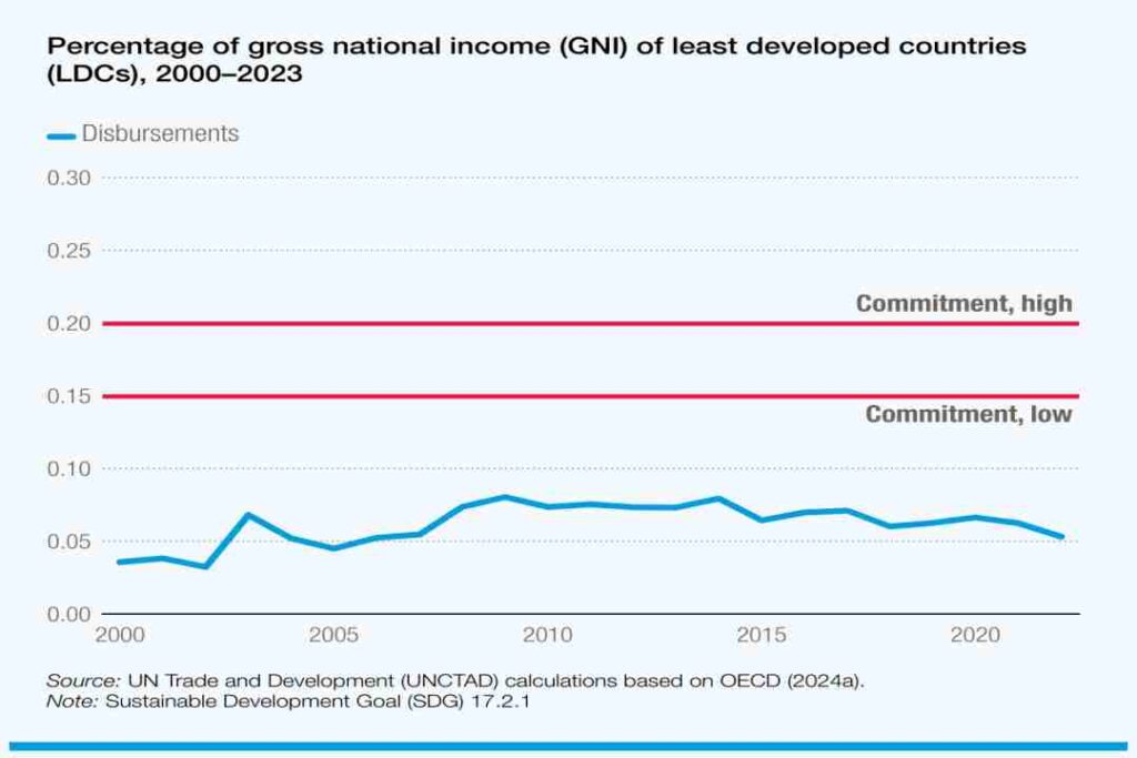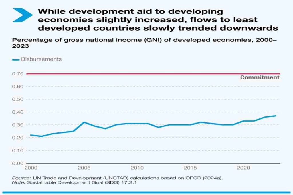 Sin embargo, los 223.700 millones de dólares desembolsados solo correspondieron al 0,37% de la renta nacional bruta de las economías desarrolladas, muy lejos del objetivo del 0,7% para revitalizar las alianzas mundiales para el desarrollo sostenible.