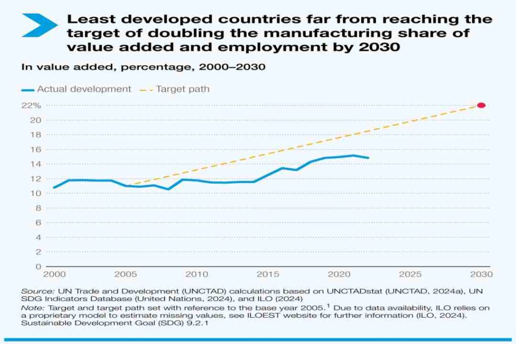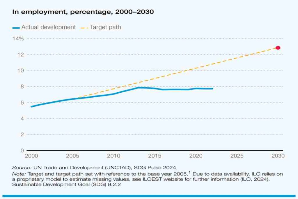 Aunque los PMA no están en vías de alcanzar la meta de los ODS de duplicar el valor añadido y el empleo en el sector manufacturero, los porcentajes de empleo relativamente constantes junto con el aumento del valor añadido sugieren una alentadora mejora general de la productividad.