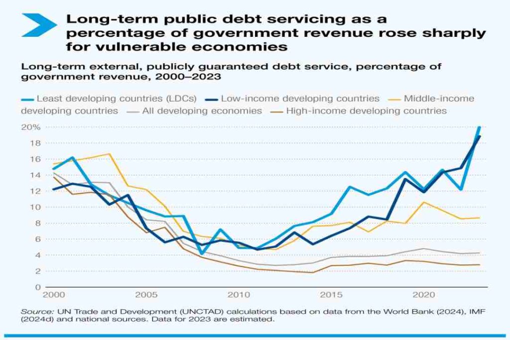 En 2023, los países de renta baja y los PMA destinaron casi el 20% de los ingresos públicos al pago de la deuda, cuatro veces más que en 2013.