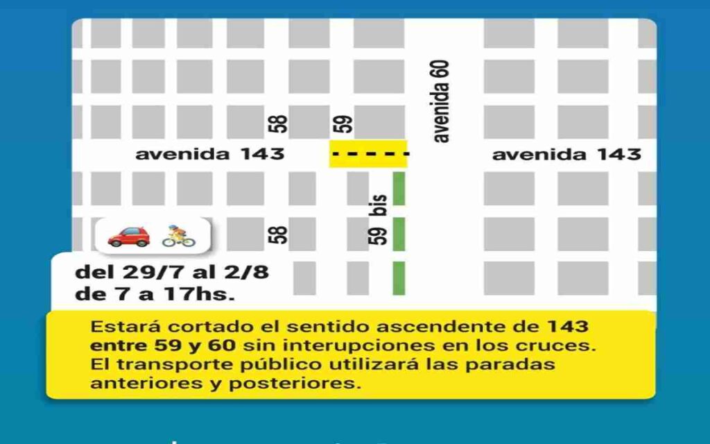 La Municipalidad de La Plata informó que, por avances en trabajos de pavimentación, del lunes 29 de julio al viernes 2 de agosto se procederá al corte del sentido ascendente de 143 entre 59 y 60 sin interrupción de cruces.