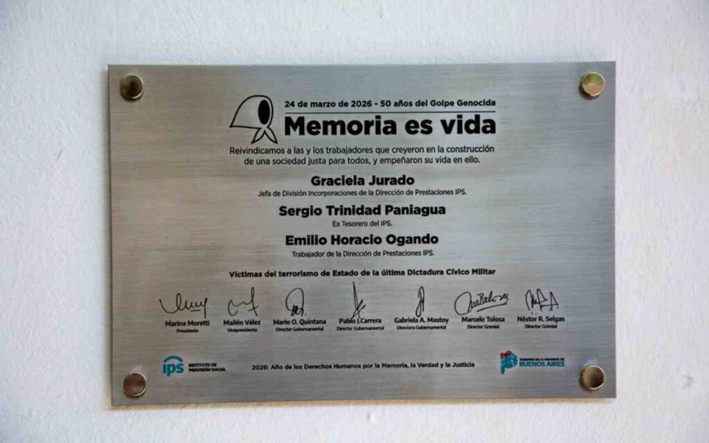 En ese marco también se descubrió una placa en homenaje a las y los trabajadores del organismo desaparecidos con la leyenda: “Memoria es vida. Reivindicamos a las y los trabajadores que creyeron en la construcción de una sociedad justa para todos, y empeñaron su vida en ello“.
