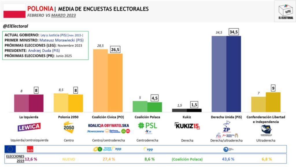 De acuerdo con la última media de encuestas electorales, Derecha Unida se mantiene primera con un 34,5 % de intención de voto, aún 9 puntos por debajo del resultado de las últimas elecciones legislativas. Coalición Cívica baja 2 puntos en un mes y se coloca con un 26,5 %. Confederación sube hasta el 9 %, superando por poco a Polonia 2050 y Izquierda, ambos en un 8 %. La conservadora Coalición Polaca se sitúa con un 4,5 %, por debajo de la barrera electoral. El derechista Kukiz se mantiene con un 1,5 %.