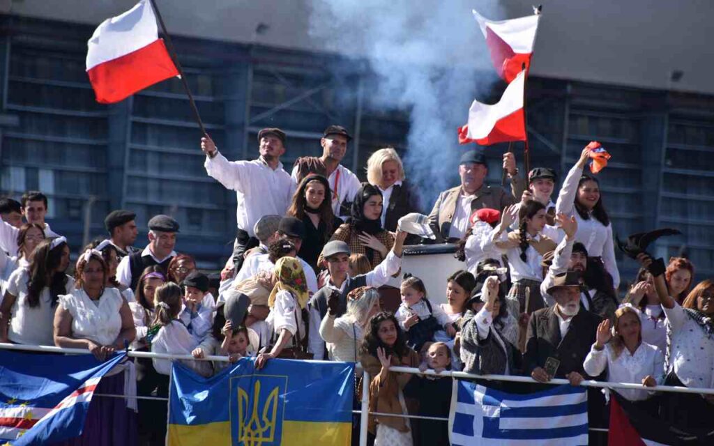 La tradicional representación comenzó con el arribo de una embarcación que tuvo como pasajeros a descendientes inmigrantes y entre ellos varios que fueron participes originales de la inmigración. Con vestimentas de época, valijas, instrumentos musicales y distintos objetos, hombres y mujeres de todas las edades descendieron, para rendir homenaje a sus familias.