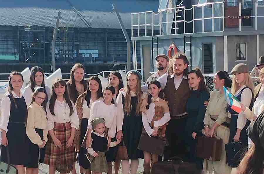 La tradicional representación comenzó con el arribo de una embarcación que tuvo como pasajeros a descendientes inmigrantes y entre ellos varios que fueron participes originales de la inmigración. Con vestimentas de época, valijas, instrumentos musicales y distintos objetos, hombres y mujeres de todas las edades descendieron, para rendir homenaje a sus familias.
