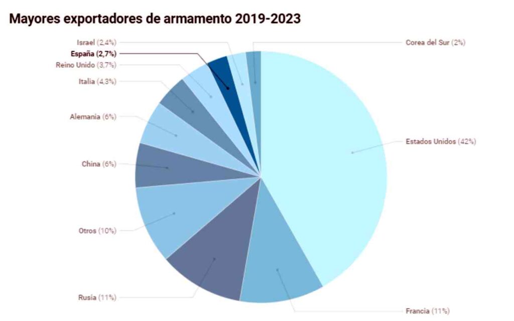 Según un estudio publicado por el Instituto Internacional de Investigación para la Paz de Estocolmo (Sipri), más del 75% de las exportaciones de armas en los últimos cinco años provienen de tan solo cinco países: Estados Unidos (42%), Francia (11%), Rusia (11%), China (5.8%) y Alemania (5.6%). Entre 2019 y 2023, cerca del 30% de las transferencias internacionales de armas se dirigieron a Oriente Medio, siendo Arabia Saudí, Qatar, Egipto e Israel los principales compradores de la región. La mayoría de las importaciones de armas de los estados de Oriente Medio provinieron de Estados Unidos (52%). Nuevamente, tanto Ucrania como un convulsionado Oriente Medio son un gran negocio para el complejo industrial–militar americano.